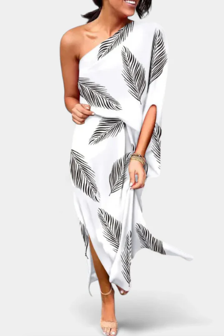 Nuestro vestido destaca por su diseño romántico y favorecedor. Con un escote de un hombro y caída fluida, es ideal para días cálidos o escapadas elegantes.
